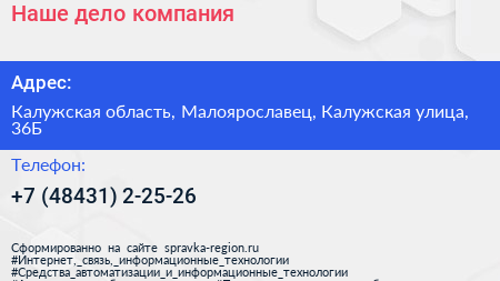 Наше дело, компания по адресу Калужская область, Малоярославец, Калужская улица, 36Б в дальнейшем Организация, размещена в следующих категориях: