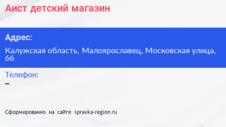Аист, детский магазин по адресу Калужская область, Малоярославец, Московская улица, 66 в дальнейшем Организация, размещена в следующих категориях: