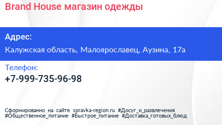 Brand House, магазин одежды по адресу Калужская область, Малоярославец, Аузина, 17а в дальнейшем Организация, размещена в следующих категориях: