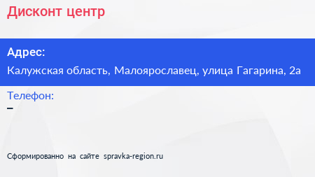 Дисконт центр по адресу Калужская область, Малоярославец, улица Гагарина, 2а в дальнейшем Организация, размещена в следующих категориях: