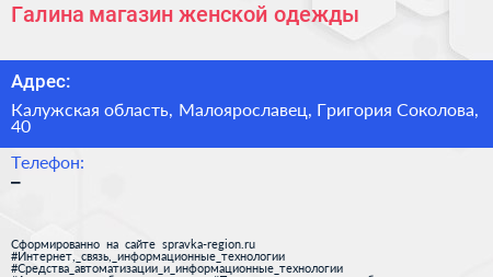 Галина, магазин женской одежды по адресу Калужская область, Малоярославец, Григория Соколова, 40 в дальнейшем Организация, размещена в следующих категориях: