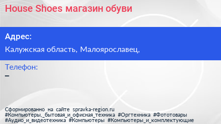 House Shoes, магазин обуви по адресу Калужская область, Малоярославец, в дальнейшем Организация, размещена в следующих категориях: