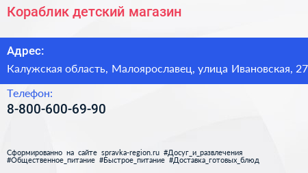 Кораблик, детский магазин по адресу Калужская область, Малоярославец, улица Ивановская, 27 в дальнейшем Организация, размещена в следующих категориях: