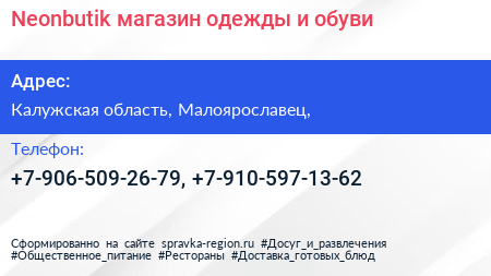 Neonbutik, магазин одежды и обуви по адресу Калужская область, Малоярославец, в дальнейшем Организация, размещена в следующих категориях: