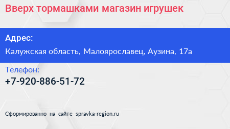 Вверх тормашками, магазин игрушек по адресу Калужская область, Малоярославец, Аузина, 17а в дальнейшем Организация, размещена в следующих категориях: