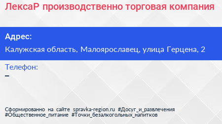 ЛексаР, производственно-торговая компания по адресу Калужская область, Малоярославец, улица Герцена, 2 в дальнейшем Организация, размещена в следующих категориях: