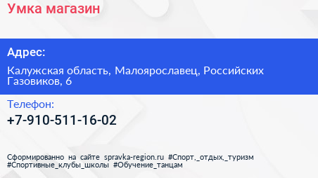 Умка, магазин по адресу Калужская область, Малоярославец, Российских Газовиков, 6 в дальнейшем Организация, размещена в следующих категориях: