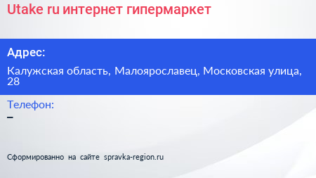 Utake.ru, интернет-гипермаркет по адресу Калужская область, Малоярославец, Московская улица, 28 в дальнейшем Организация, размещена в следующих категориях: