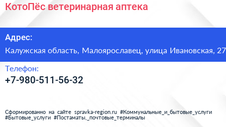 КотоПёс, ветеринарная аптека по адресу Калужская область, Малоярославец, улица Ивановская, 27 в дальнейшем Организация, размещена в следующих категориях: