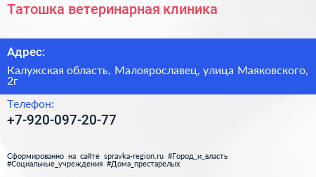 Татошка, ветеринарная клиника по адресу Калужская область, Малоярославец, улица Маяковского, 2г в дальнейшем Организация, размещена в следующих категориях: