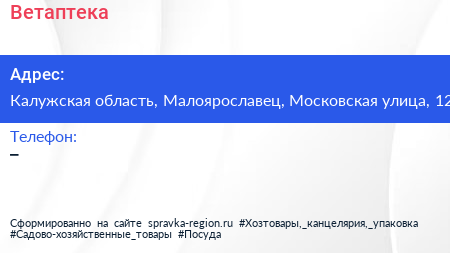 Ветаптека по адресу Калужская область, Малоярославец, Московская улица, 12 в дальнейшем Организация, размещена в следующих категориях: