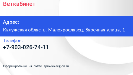 Веткабинет по адресу Калужская область, Малоярославец, Заречная улица, 1 в дальнейшем Организация, размещена в следующих категориях: