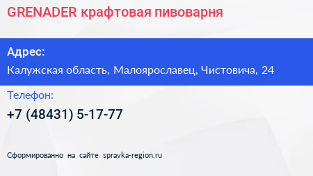 GRENADER, крафтовая пивоварня по адресу Калужская область, Малоярославец, Чистовича, 24 в дальнейшем Организация, размещена в следующих категориях: