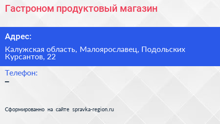 Гастроном, продуктовый магазин по адресу Калужская область, Малоярославец, Подольских Курсантов, 22 в дальнейшем Организация, размещена в следующих категориях: