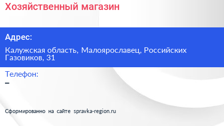 Хозяйственный магазин по адресу Калужская область, Малоярославец, Российских Газовиков, 31 в дальнейшем Организация, размещена в следующих категориях: