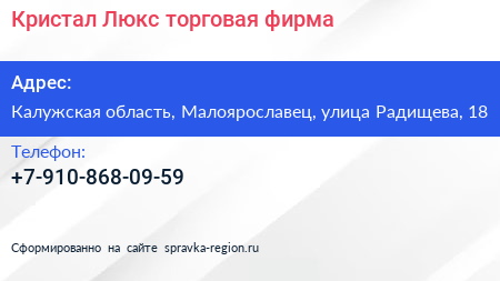 Кристал Люкс, торговая фирма по адресу Калужская область, Малоярославец, улица Радищева, 18 в дальнейшем Организация, размещена в следующих категориях:
