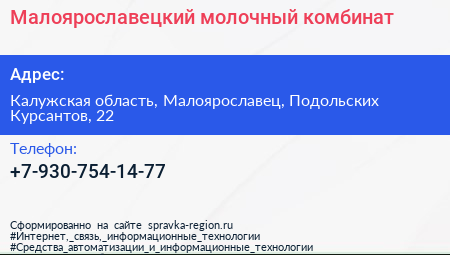 Малоярославецкий молочный комбинат по адресу Калужская область, Малоярославец, Подольских Курсантов, 22 в дальнейшем Организация, размещена в следующих категориях: