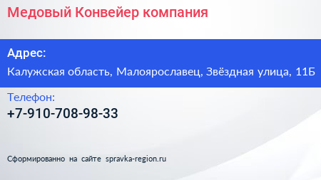 Медовый Конвейер, компания по адресу Калужская область, Малоярославец, Звёздная улица, 11Б в дальнейшем Организация, размещена в следующих категориях: