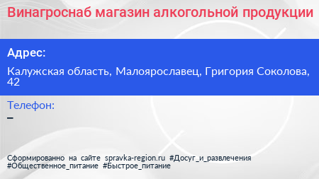 Винагроснаб, магазин алкогольной продукции по адресу Калужская область, Малоярославец, Григория Соколова, 42 в дальнейшем Организация, размещена в следующих категориях:
