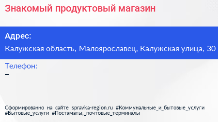Знакомый, продуктовый магазин по адресу Калужская область, Малоярославец, Калужская улица, 30 в дальнейшем Организация, размещена в следующих категориях: