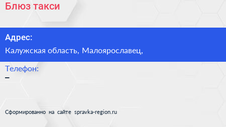 Блюз, такси по адресу Калужская область, Малоярославец, в дальнейшем Организация, размещена в следующих категориях: