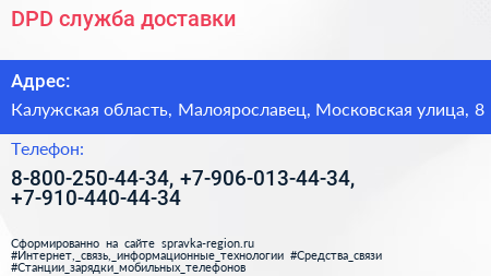 DPD, служба доставки по адресу Калужская область, Малоярославец, Московская улица, 8 в дальнейшем Организация, размещена в следующих категориях: