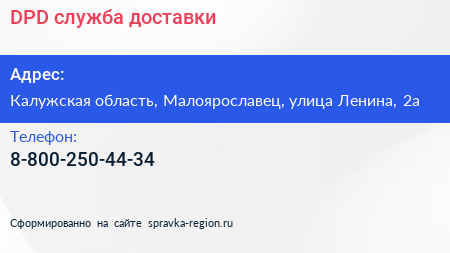 DPD, служба доставки по адресу Калужская область, Малоярославец, улица Ленина, 2а в дальнейшем Организация, размещена в следующих категориях: