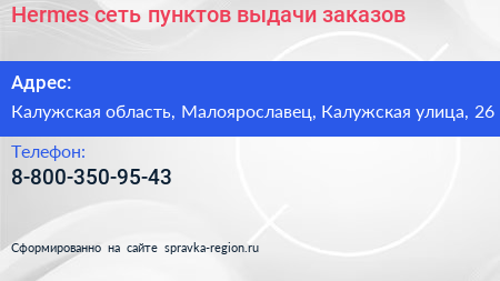 Hermes, сеть пунктов выдачи заказов по адресу Калужская область, Малоярославец, Калужская улица, 26 в дальнейшем Организация, размещена в следующих категориях: