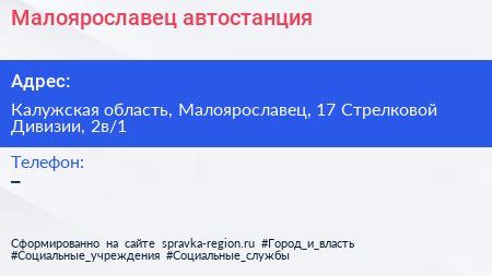 Малоярославец, автостанция по адресу Калужская область, Малоярославец, 17 Стрелковой Дивизии, 2в/1 в дальнейшем Организация, размещена в следующих категориях: