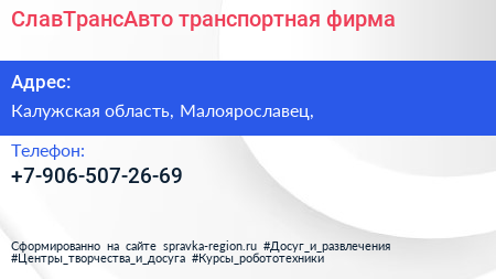 СлавТрансАвто, транспортная фирма по адресу Калужская область, Малоярославец, в дальнейшем Организация, размещена в следующих категориях: