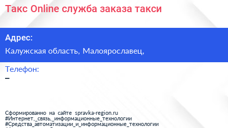 Такс.Online, служба заказа такси по адресу Калужская область, Малоярославец, в дальнейшем Организация, размещена в следующих категориях: