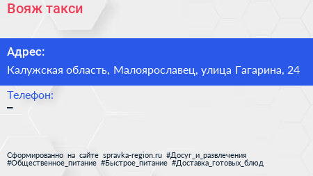 Вояж, такси по адресу Калужская область, Малоярославец, улица Гагарина, 24 в дальнейшем Организация, размещена в следующих категориях: