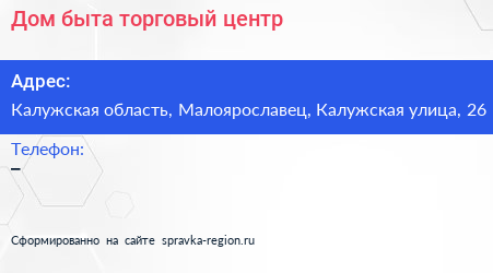 Дом быта, торговый центр по адресу Калужская область, Малоярославец, Калужская улица, 26 в дальнейшем Организация, размещена в следующих категориях: