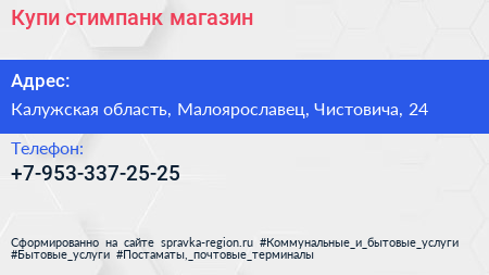 Купи-стимпанк, магазин по адресу Калужская область, Малоярославец, Чистовича, 24 в дальнейшем Организация, размещена в следующих категориях: