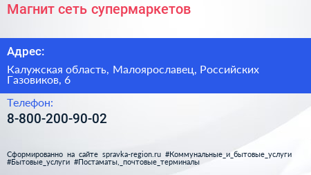 Магнит, сеть супермаркетов по адресу Калужская область, Малоярославец, Российских Газовиков, 6 в дальнейшем Организация, размещена в следующих категориях: