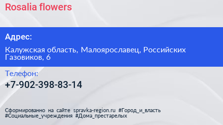 Rosalia flowers по адресу Калужская область, Малоярославец, Российских Газовиков, 6 в дальнейшем Организация, размещена в следующих категориях: