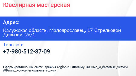 Ювелирная мастерская по адресу Калужская область, Малоярославец, 17 Стрелковой Дивизии, 2в/1 в дальнейшем Организация, размещена в следующих категориях: