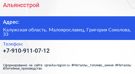 Альянсстрой по адресу Калужская область, Малоярославец, Григория Соколова, 33 в дальнейшем Организация, размещена в следующих категориях: