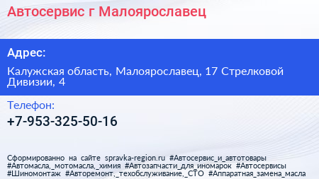 Автосервис, г. Малоярославец по адресу Калужская область, Малоярославец, 17 Стрелковой Дивизии, 4 в дальнейшем Организация, размещена в следующих категориях: