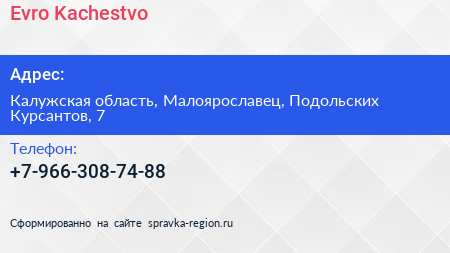 Evro Kachestvo по адресу Калужская область, Малоярославец, Подольских Курсантов, 7 в дальнейшем Организация, размещена в следующих категориях: