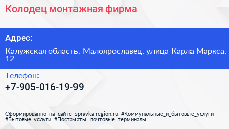 Колодец, монтажная фирма по адресу Калужская область, Малоярославец, улица Карла Маркса, 12 в дальнейшем Организация, размещена в следующих категориях: