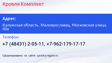 Кровля Комплект по адресу Калужская область, Малоярославец, Московская улица, 60а в дальнейшем Организация, размещена в следующих категориях: