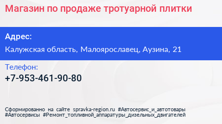 Магазин по продаже тротуарной плитки по адресу Калужская область, Малоярославец, Аузина, 21 в дальнейшем Организация, размещена в следующих категориях: