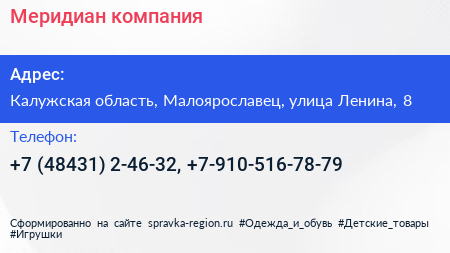 Меридиан, компания по адресу Калужская область, Малоярославец, улица Ленина, 8 в дальнейшем Организация, размещена в следующих категориях:
