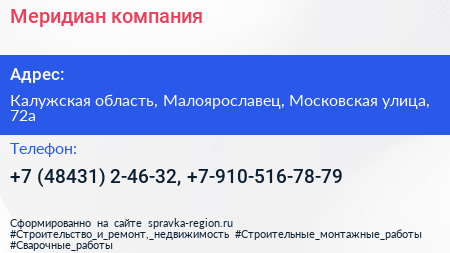 Меридиан, компания по адресу Калужская область, Малоярославец, Московская улица, 72а в дальнейшем Организация, размещена в следующих категориях: