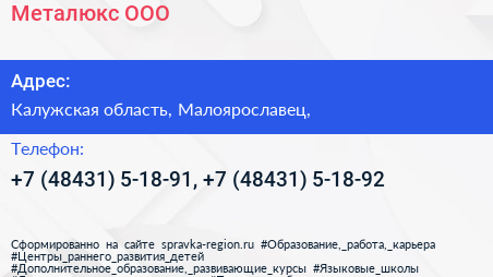 Металюкс, ООО по адресу Калужская область, Малоярославец, в дальнейшем Организация, размещена в следующих категориях:
