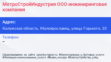 МетроСтройИндустрия, ООО, инжиниринговая компания по адресу Калужская область, Малоярославец, улица Горького, 33 в дальнейшем Организация, размещена в следующих категориях: