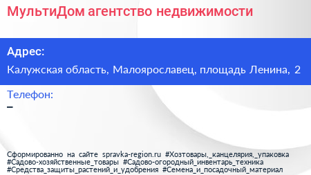 МультиДом, агентство недвижимости по адресу Калужская область, Малоярославец, площадь Ленина, 2 в дальнейшем Организация, размещена в следующих категориях: