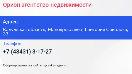 Орион, агентство недвижимости по адресу Калужская область, Малоярославец, Григория Соколова, 33 в дальнейшем Организация, размещена в следующих категориях: