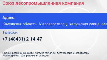Союз, лесопромышленная компания по адресу Калужская область, Малоярославец, Калужская улица, 44а в дальнейшем Организация, размещена в следующих категориях:
